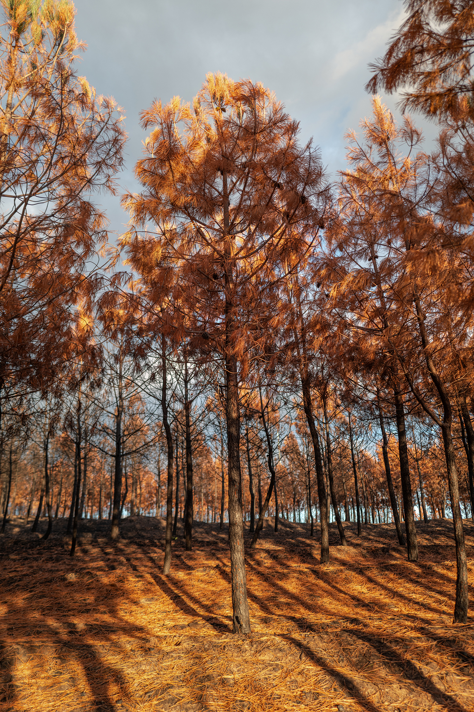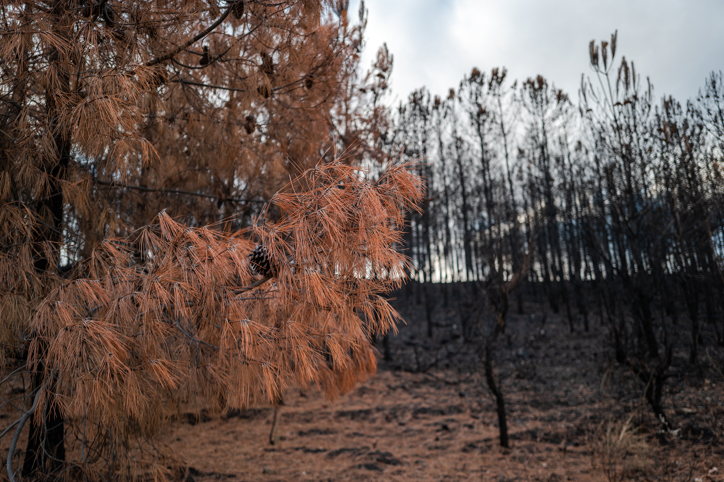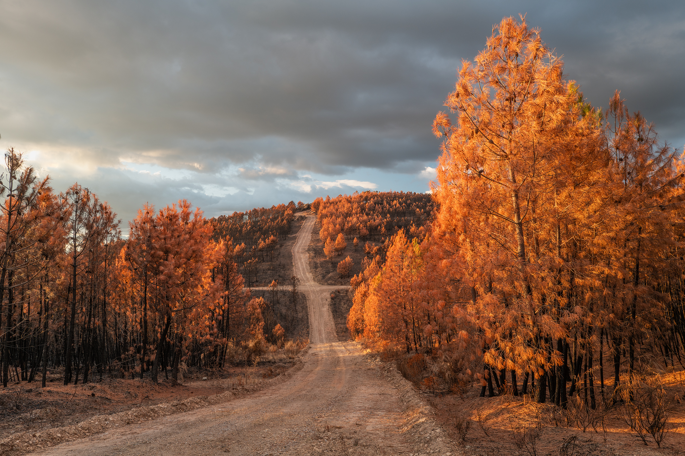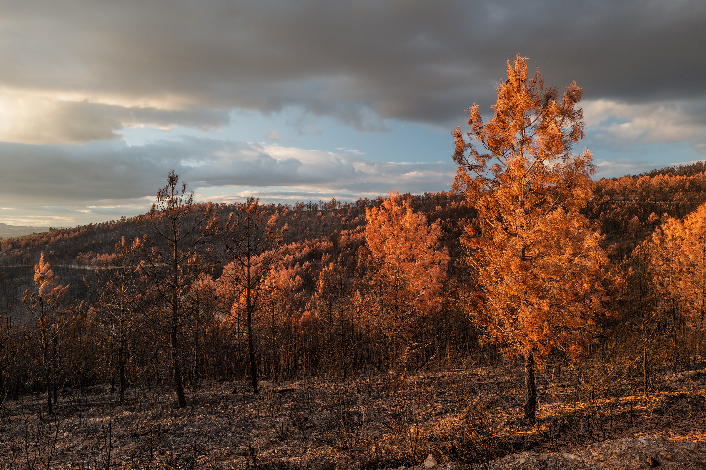 Clouds gathered, skies turned more dramatic. I passed areas that burned last August; the native species are stubborn, resilient — they resist. In some places, the trees looked like fire coming out of the ash.
