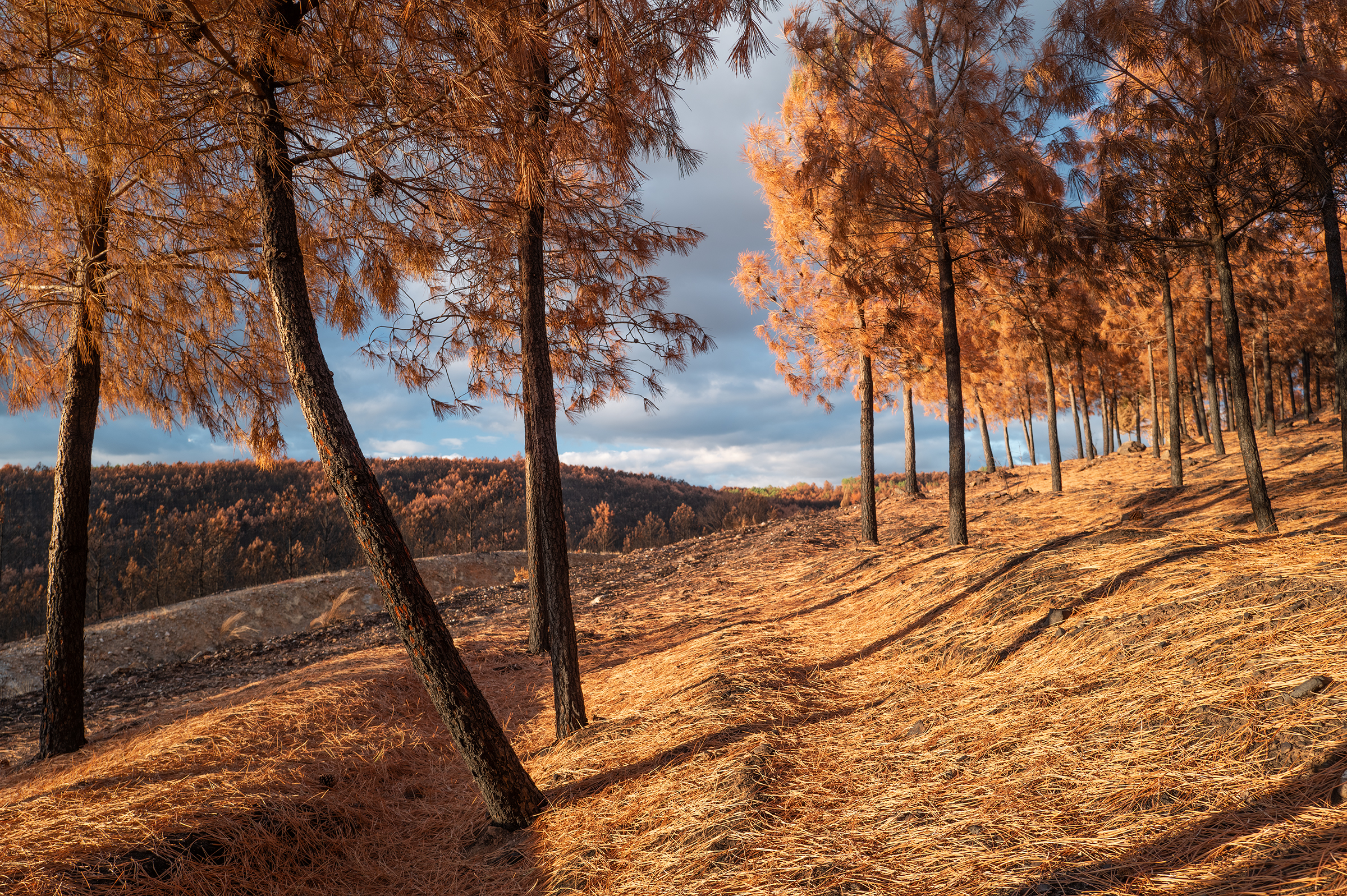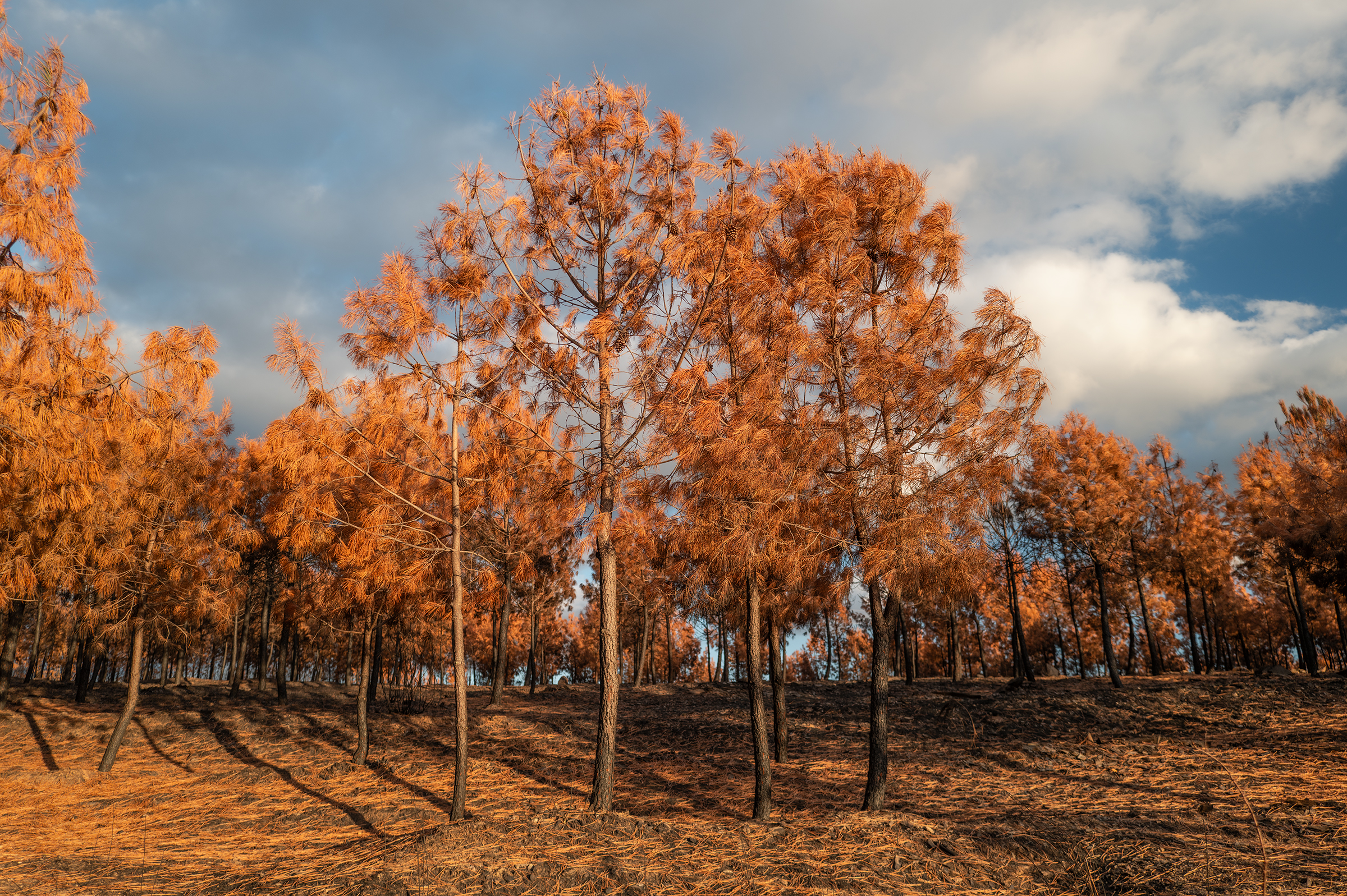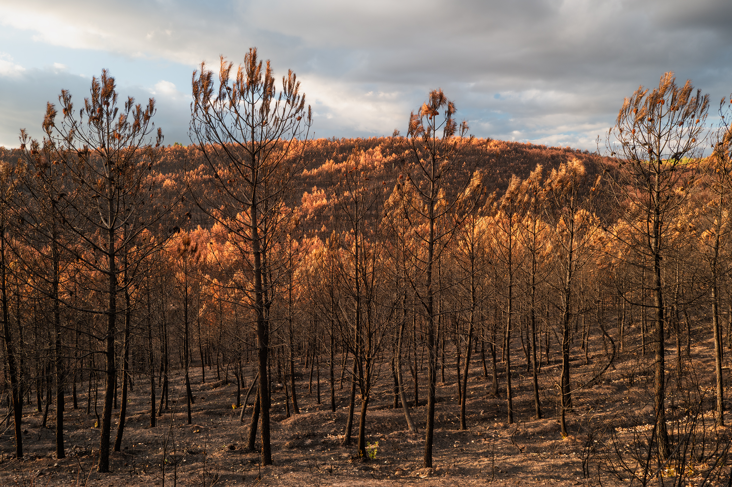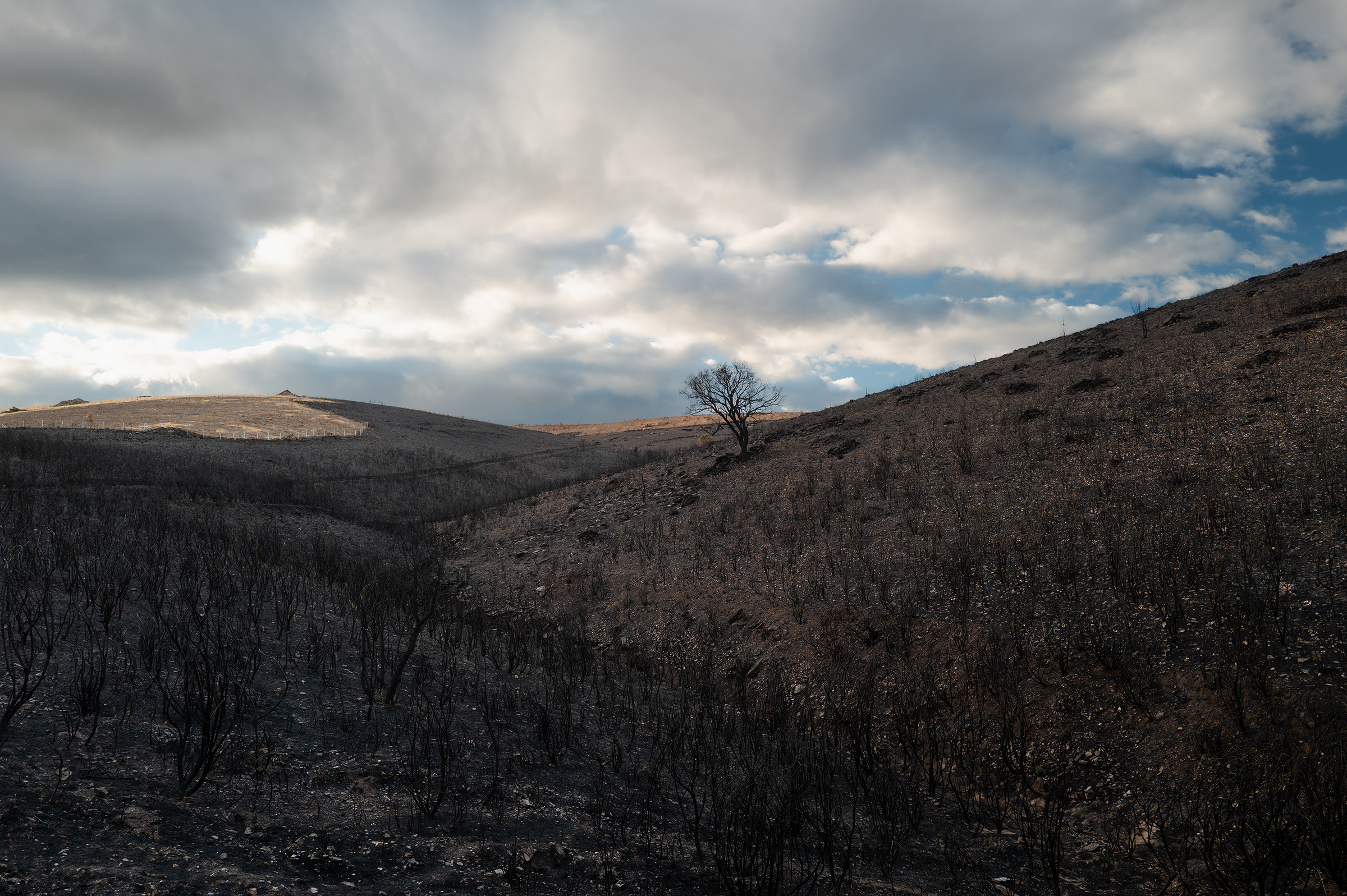 Clouds gathered, skies turned more dramatic. I passed areas that burned last August; the native species are stubborn, resilient — they resist. In some places, the trees looked like fire coming out of the ash.
