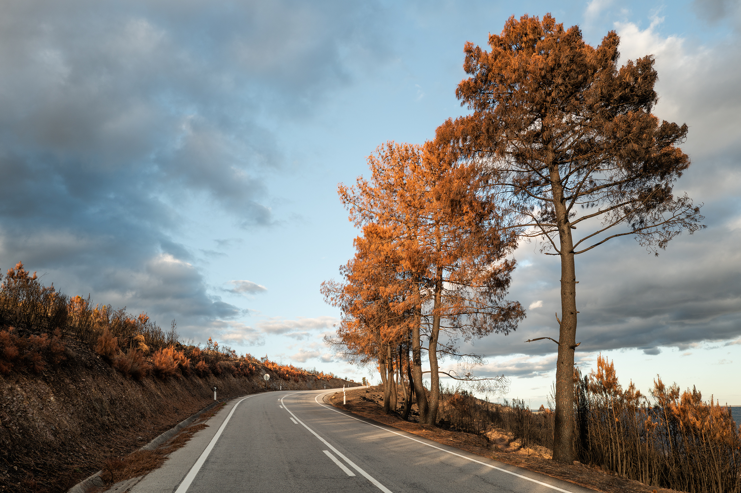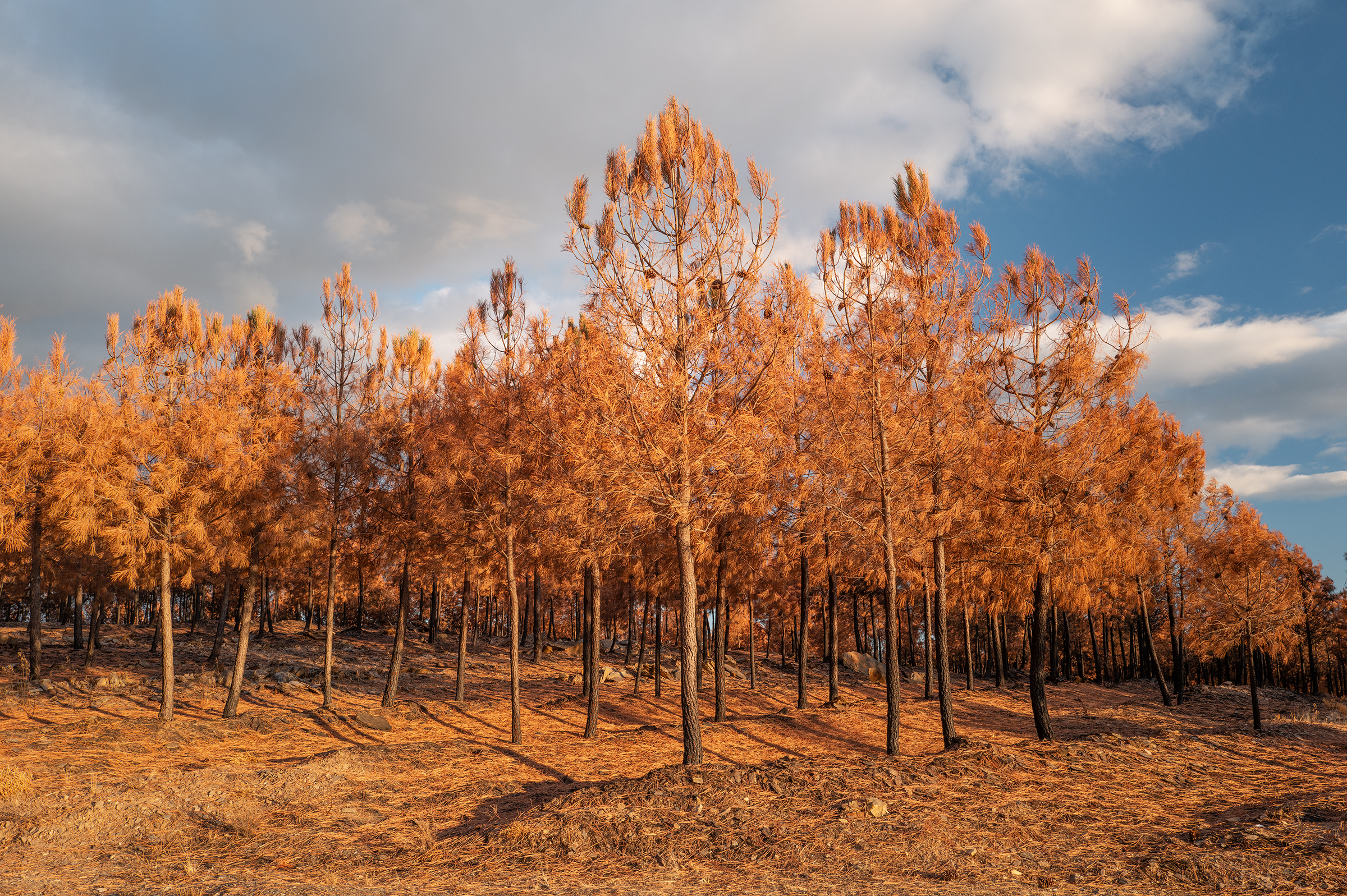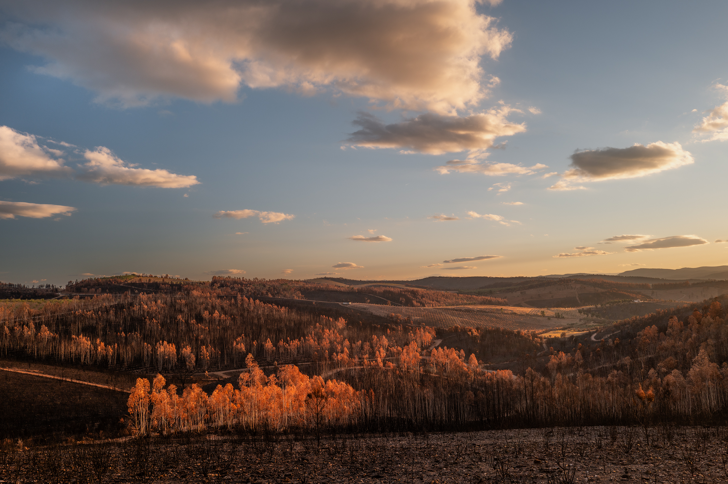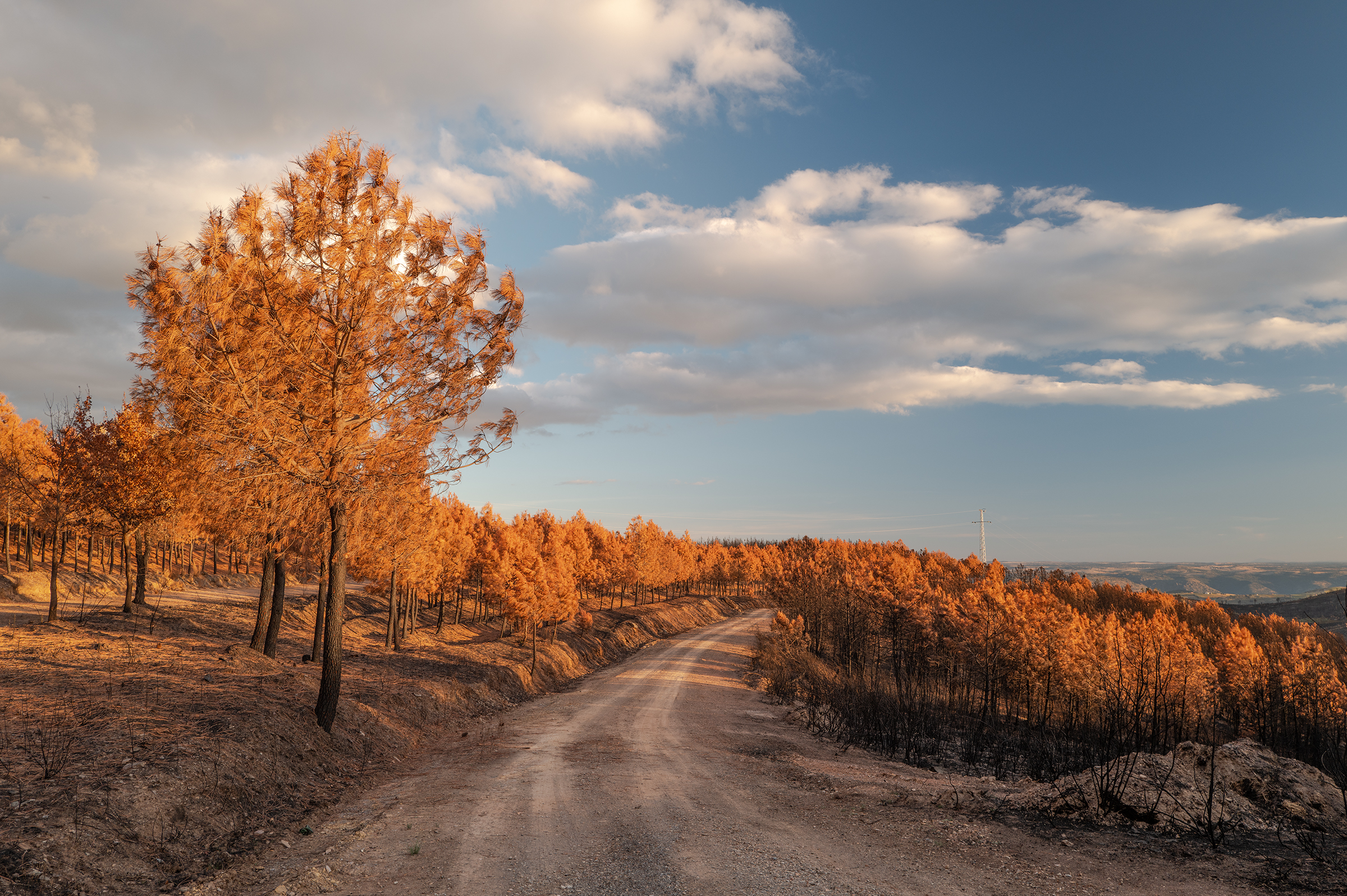 Clouds gathered, skies turned more dramatic. I passed areas that burned last August; the native species are stubborn, resilient — they resist. In some places, the trees looked like fire coming out of the ash.