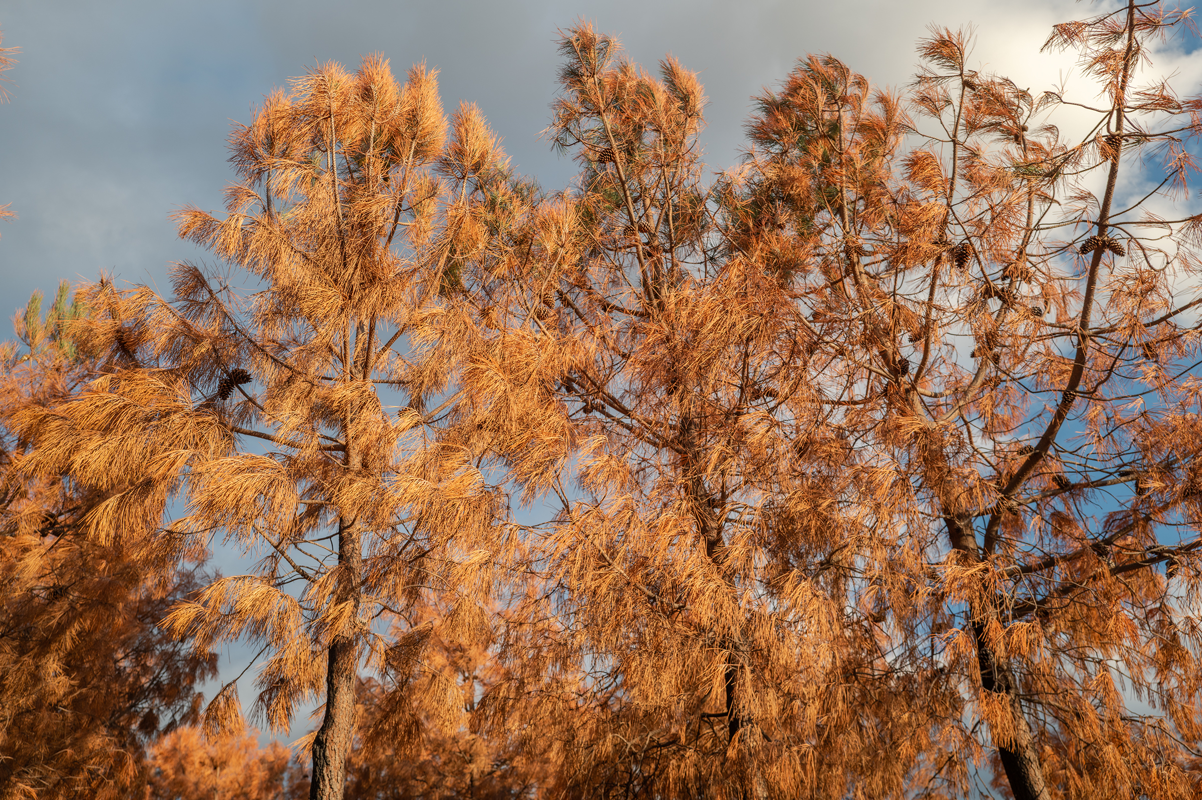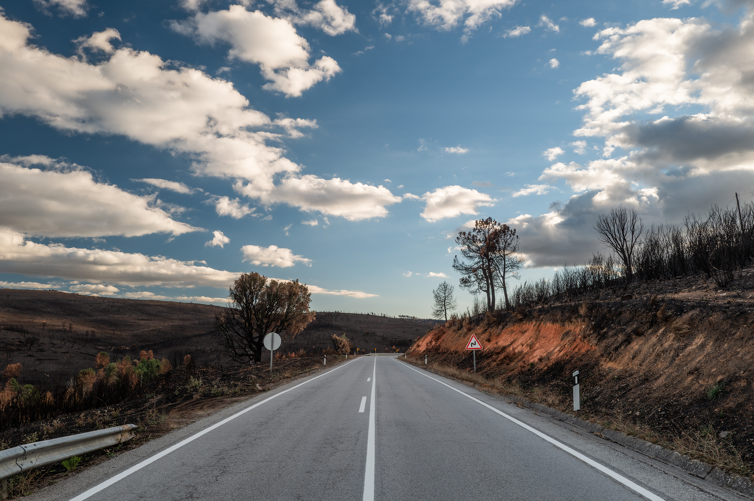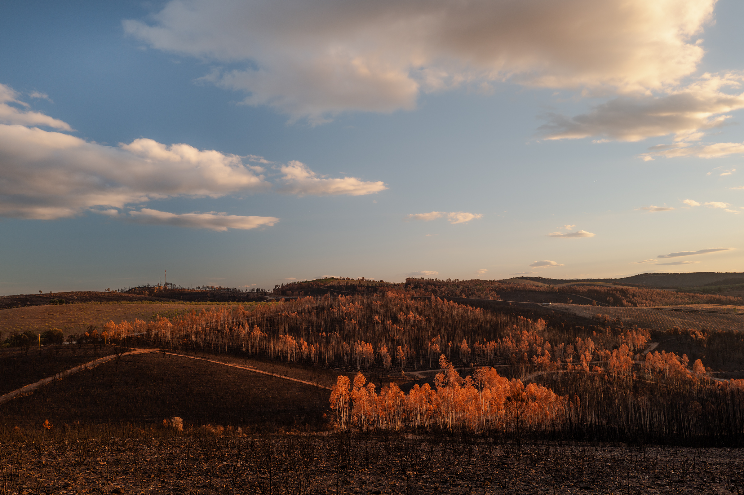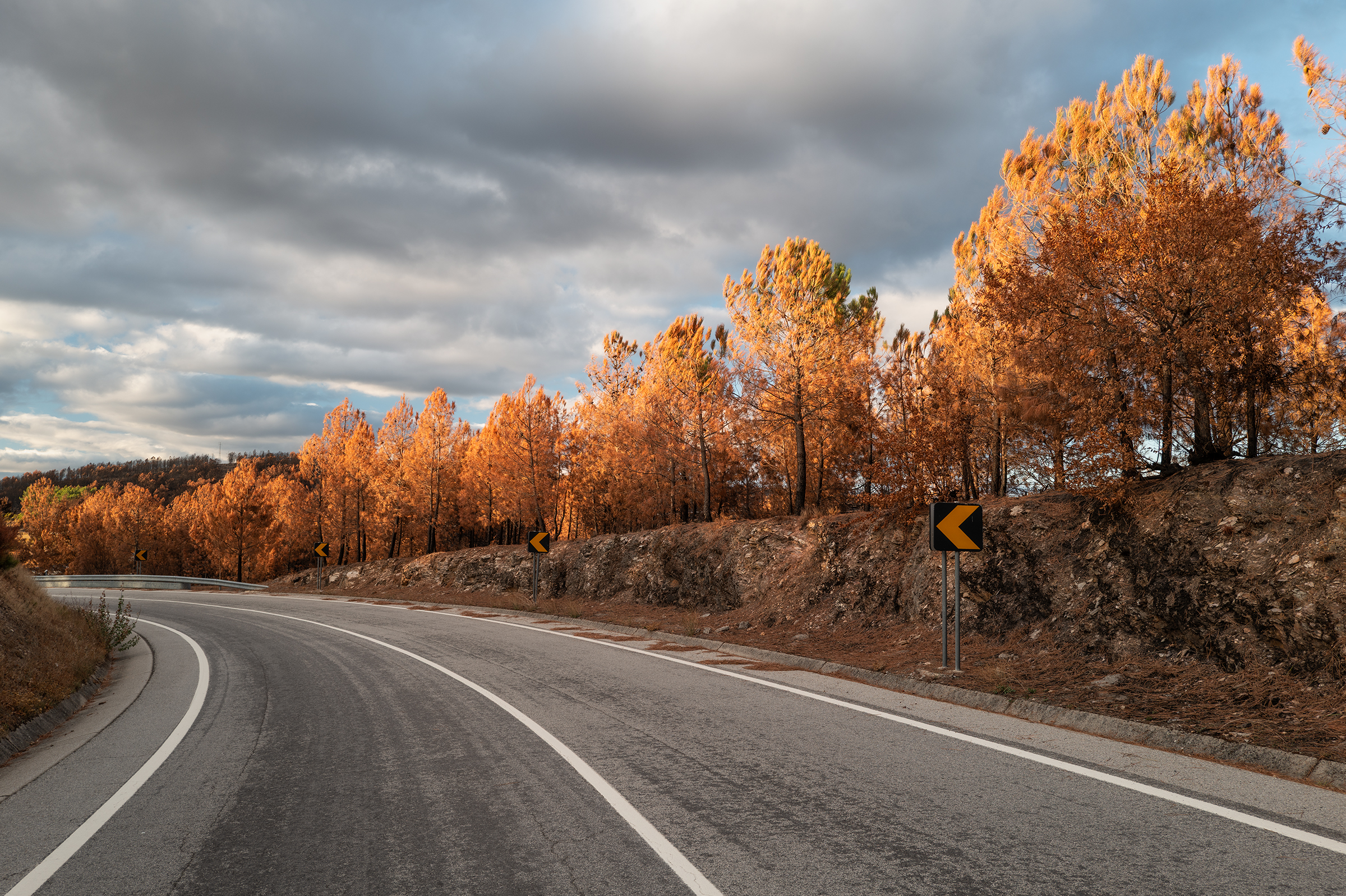 Clouds gathered, skies turned more dramatic. I passed areas that burned last August; the native species are stubborn, resilient — they resist. In some places, the trees looked like fire coming out of the ash.